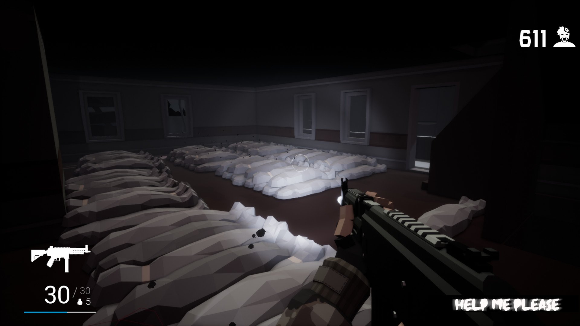 Help Me Please - Try to survive the first location of the game. Beware of traps, mines, and zombies; remember, everything is against you here. If you suddenly find yourself running low on ammo, it means you're wasting it. Remember, there's always a knife. However, when using the knife, keep in mind that you only have one life, and you can't replenish it, so letting zombies get too close is a bad idea. Use traps to your advantage and eliminate zombies with them.