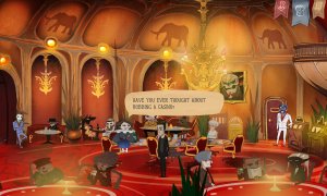 Each level in Whateverland can be completed in at least two different ways, either by stealing from the inhabitants or assisting them. The rich dialogues not only provide insights into the world and its characters but also affect relationships with the residents and the sidekick, Nick. The game does not follow a strict chapter order, allowing players to switch between chapters if they feel stuck.