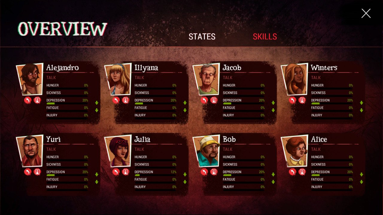 Key features of Dead In Bermuda include managing the well-being of your team, as they can succumb to hunger, fatigue, sickness, injury, depression, and dehydration. The game also features dynamic relationships between characters, who can argue, form friendships, or even fall in love. The deep RPG system ensures that the efficiency of every action is influenced by character skills, opinions, and their current state.