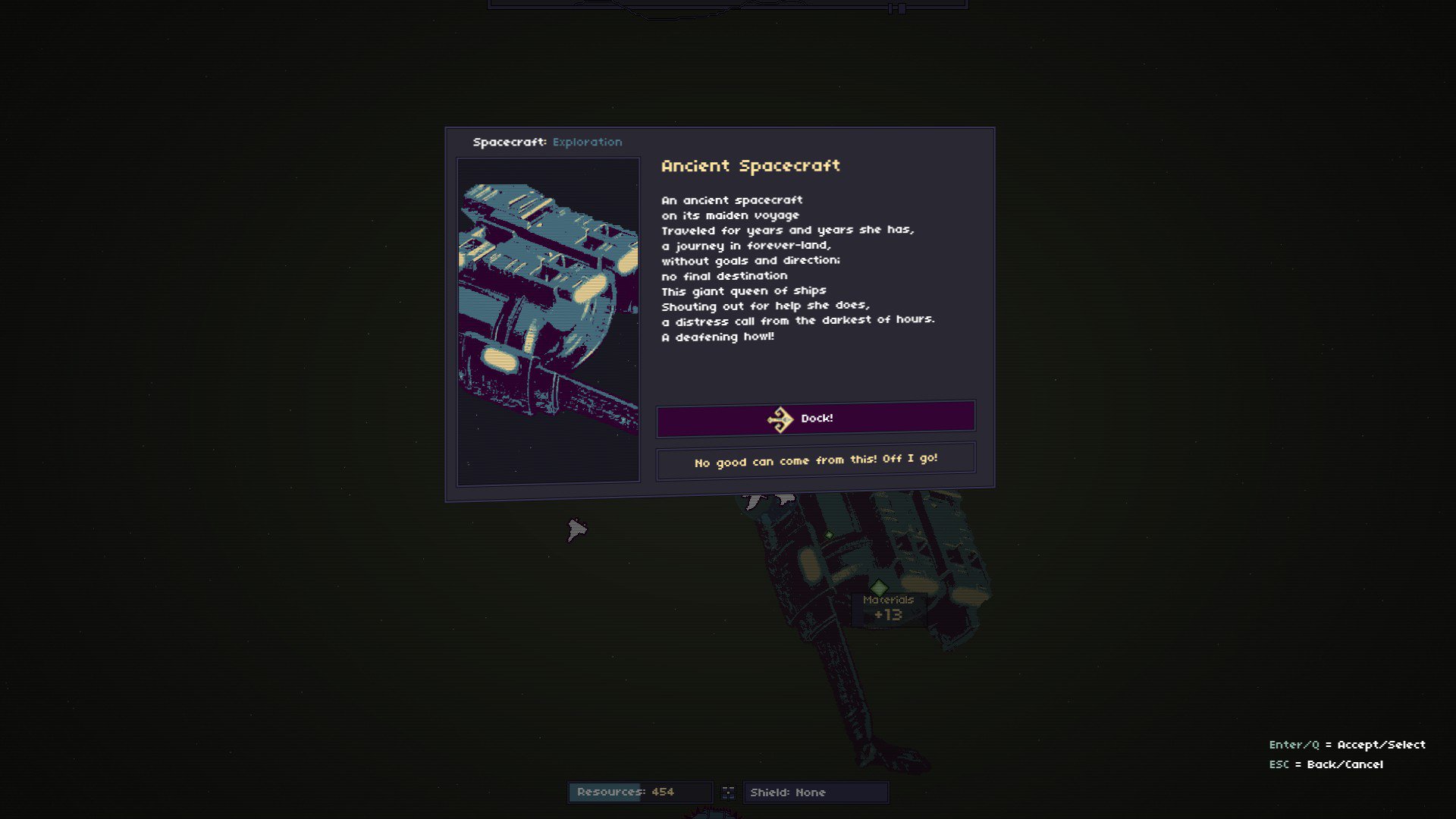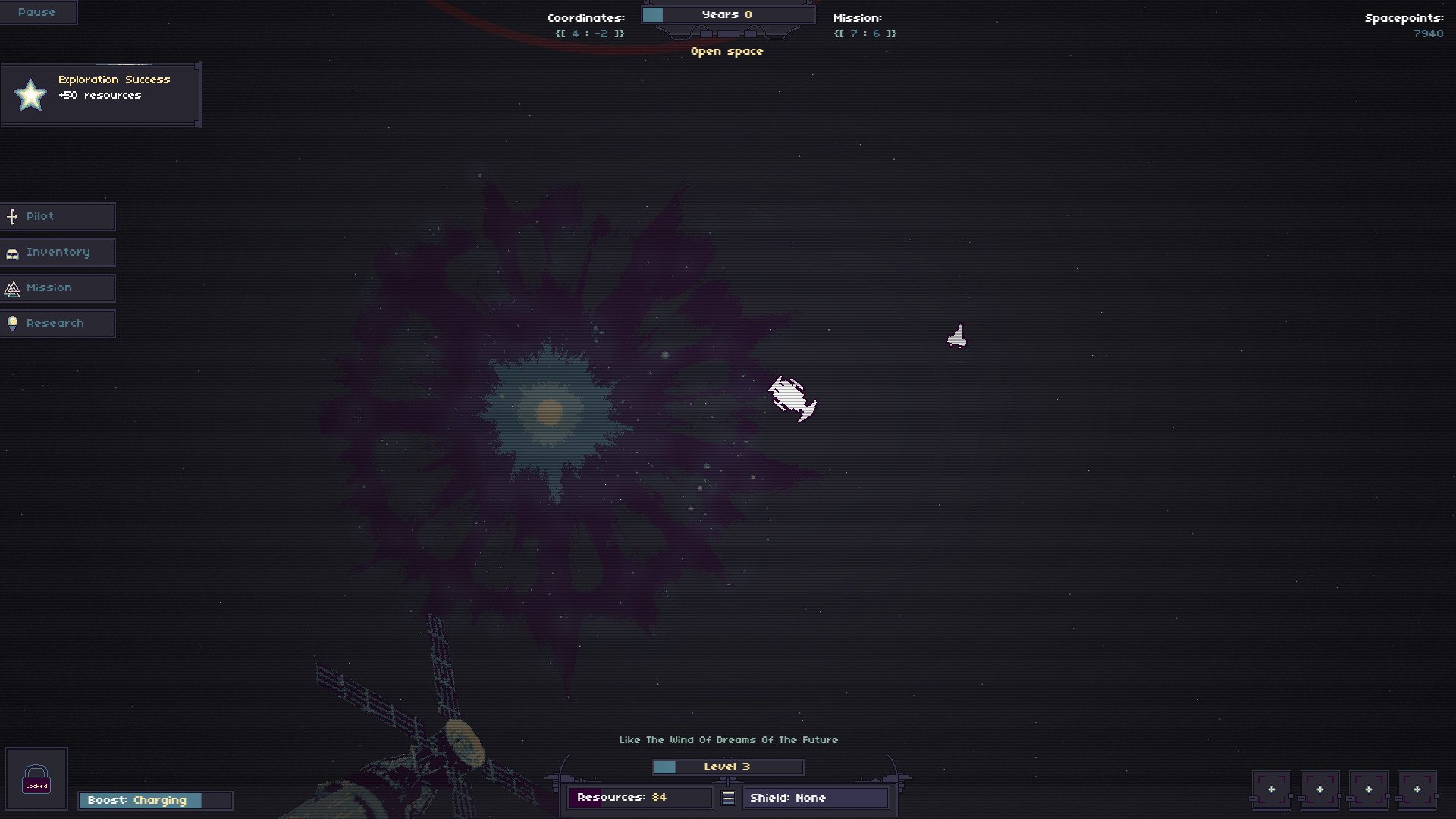 The game is visually captivating, blending pixel art with a posterized style and a strict color palette. An original soundtrack by Tom Croke and Pat Jacobs complements the experience, with each ship having its own unique music. The story is conveyed through a poetic voice log, reflecting on loss and the passage of time, offering an abstract and introspective narrative.