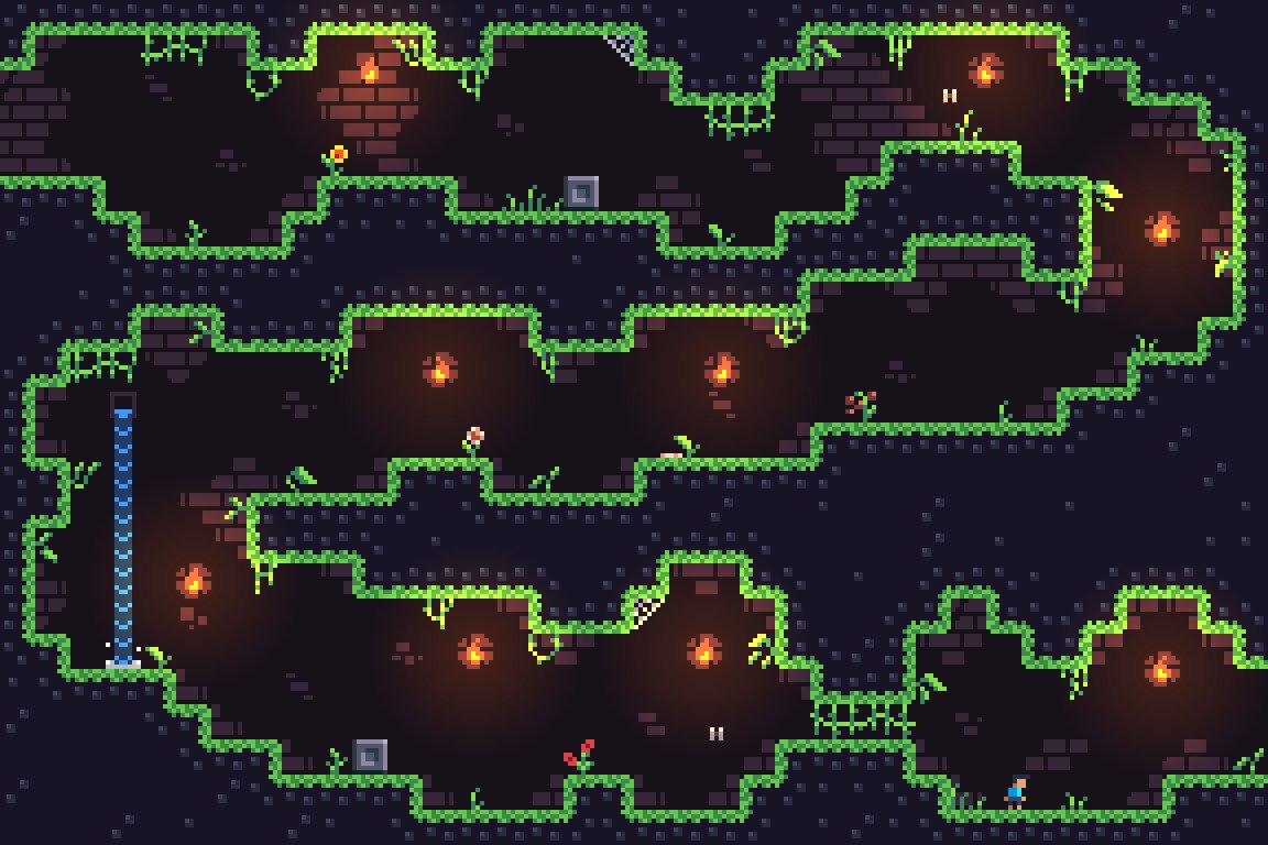 Cursed Gem offers a challenging experience filled with deadly traps and precision platforming across more than 10 levels and over 80 uniquely designed rooms. The game features various difficulty modes, including a "nightmare" mode where you navigate the cave in darkness with only a light helmet. Players can also leave messages on the walls for others, reminiscent of the Dark Souls series.
