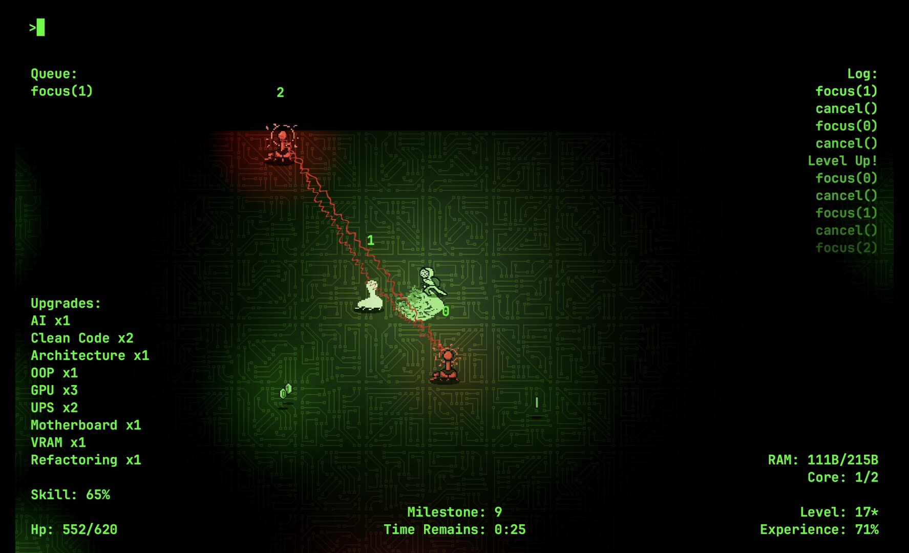 HackeRPG - a unique and innovative arena roguelike that merges the thrill of hacking with intense virtual combat. In this game, players dive into a digital landscape swarming with bugs, viruses, trojans, and other malicious entities—each with their own unique behaviors and vulnerabilities. The core challenge is to use strategic coding skills to survive in a relentless arena for 15 minutes against these ever-evolving threats.