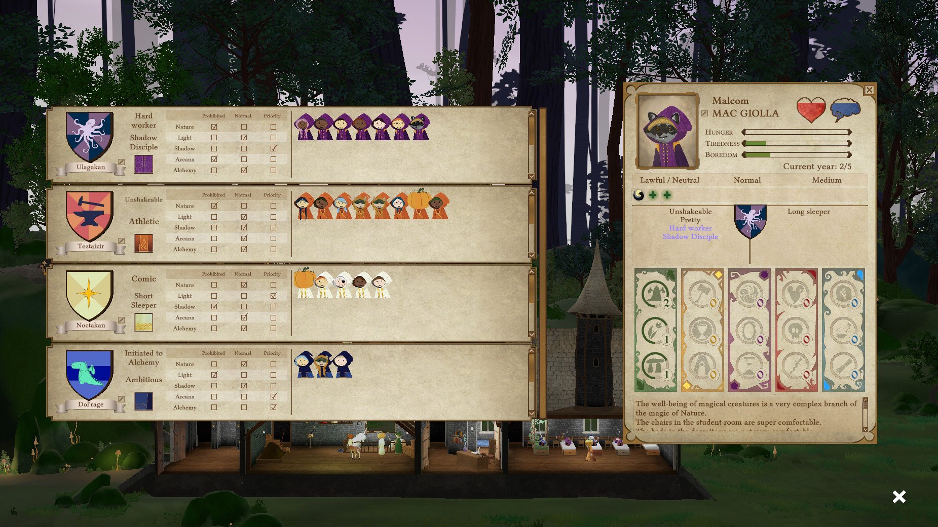 Manage your students’ well-being by constructing essential buildings such as refectories, dormitories, and rest areas, while even incorporating a dungeon to keep unruly behavior in check. Every student comes with unique traits, personalities, and backgrounds, and their performance may lead them to become necromancers, archmages, or even commoners—each outcome granting you different bonuses.