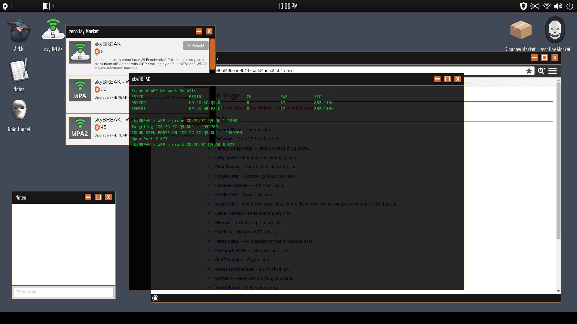 To track down Amalea, you must uncover eight hidden hashes spread throughout the deep web. These hashes are the key to decrypting the shadow web browser, and you’ll find them by exploring web pages, carefully inspecting their content, examining source code, or even searching within hidden files. All of this is done through a simulated computer operating system on Clint’s computer. The OS includes a range of tools to aid your mission, such as a web browser (named A.N.N), note-taking software, and even options to purchase specialized software packages like zeroDAY.