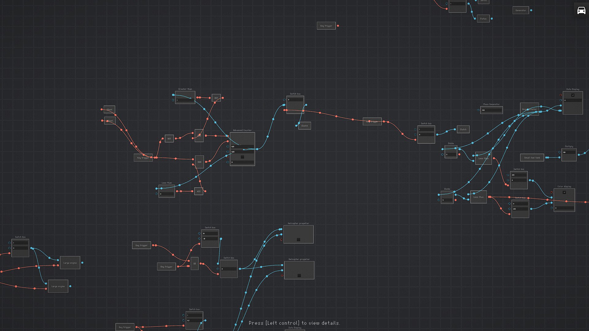 After constructing the mechanical part of your creation, the game introduces an accessible yet deep programming system. Instead of traditional coding, you work with nodes that represent different inputs and outputs, connecting them to set up your creation’s circuitry. With more than 60 nodes at your disposal—most of which handle mathematical operations and functions—this system offers a great balance between ease of use and depth, allowing you to bring your designs to life.
