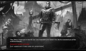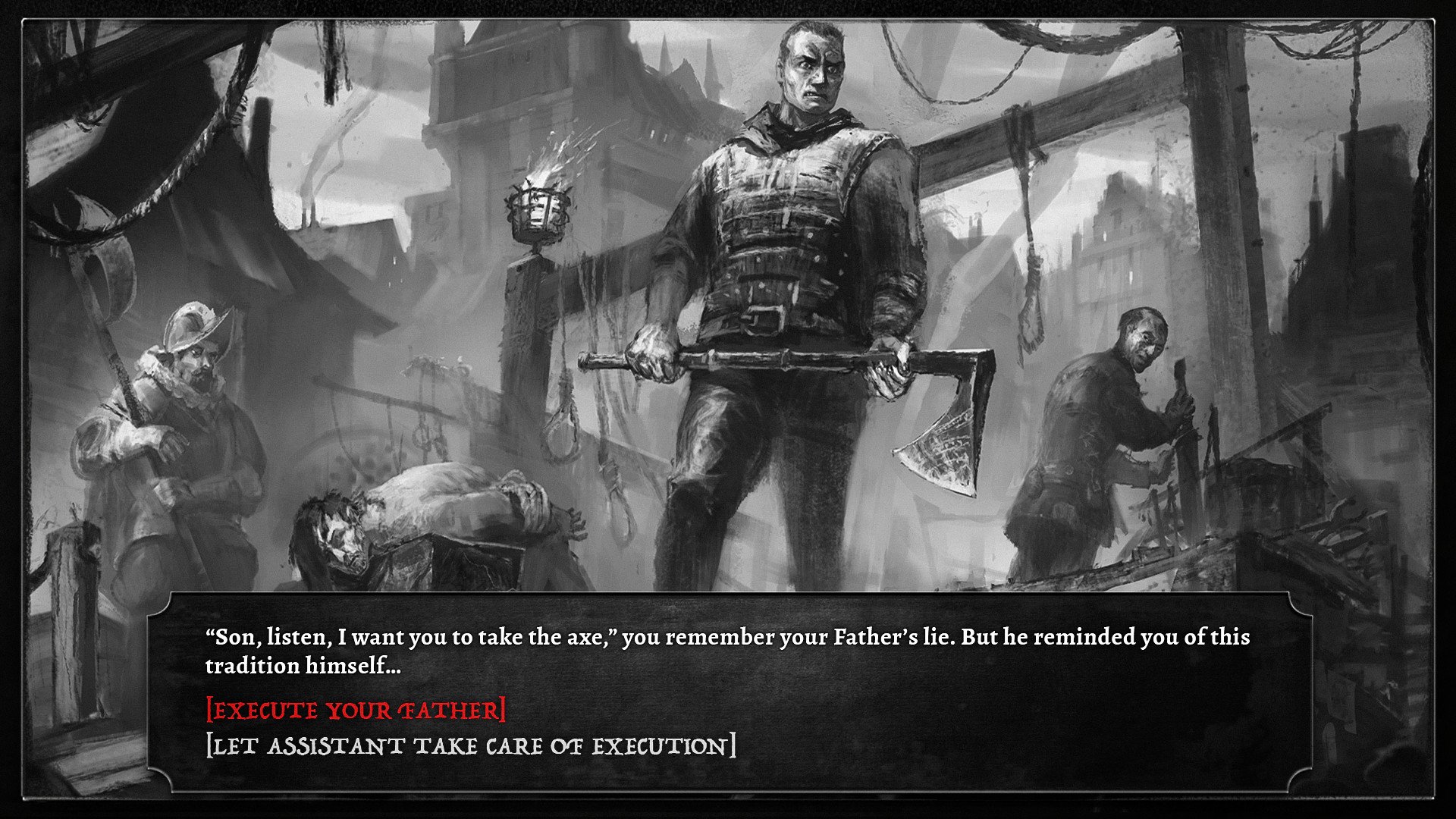 The Executioner features a predominantly text-based interface that unfolds an engaging and dark narrative, set in a world filled with moral ambiguity. As the threat of revolution looms, players must decide whether to support the monarchy and tradition or to fight for progress. The game also presents choices between embracing emerging science or following a mystical path, and whether to become desensitized to violence or strive to preserve one's humanity.