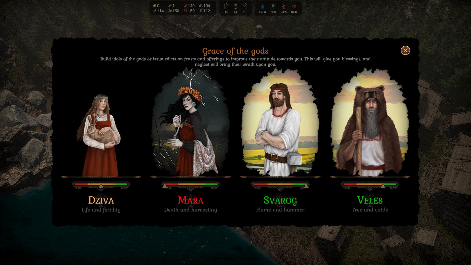 Grimgrad is rich with random events and incorporates elements of Slavic folklore, including gods and mythical creatures. Players must carefully consider their actions to appease these deities and make the right choices to ensure the prosperity of their village.
