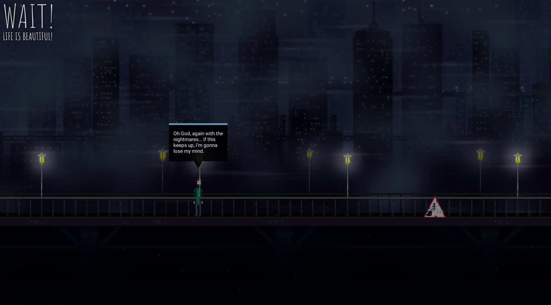 Wait! Life is Beautiful! is an interactive narrative experience that combines cinema-like storytelling with thoughtful, sometimes dark, humor. The game follows an ordinary young man—a regular office clerk whose life has become monotonous and empty—until he decides to make a change. Leaving behind his unfulfilling job, he ventures to a notorious Suicide Bridge every night, determined to reach out to those on the brink and remind them that life still holds beauty.
