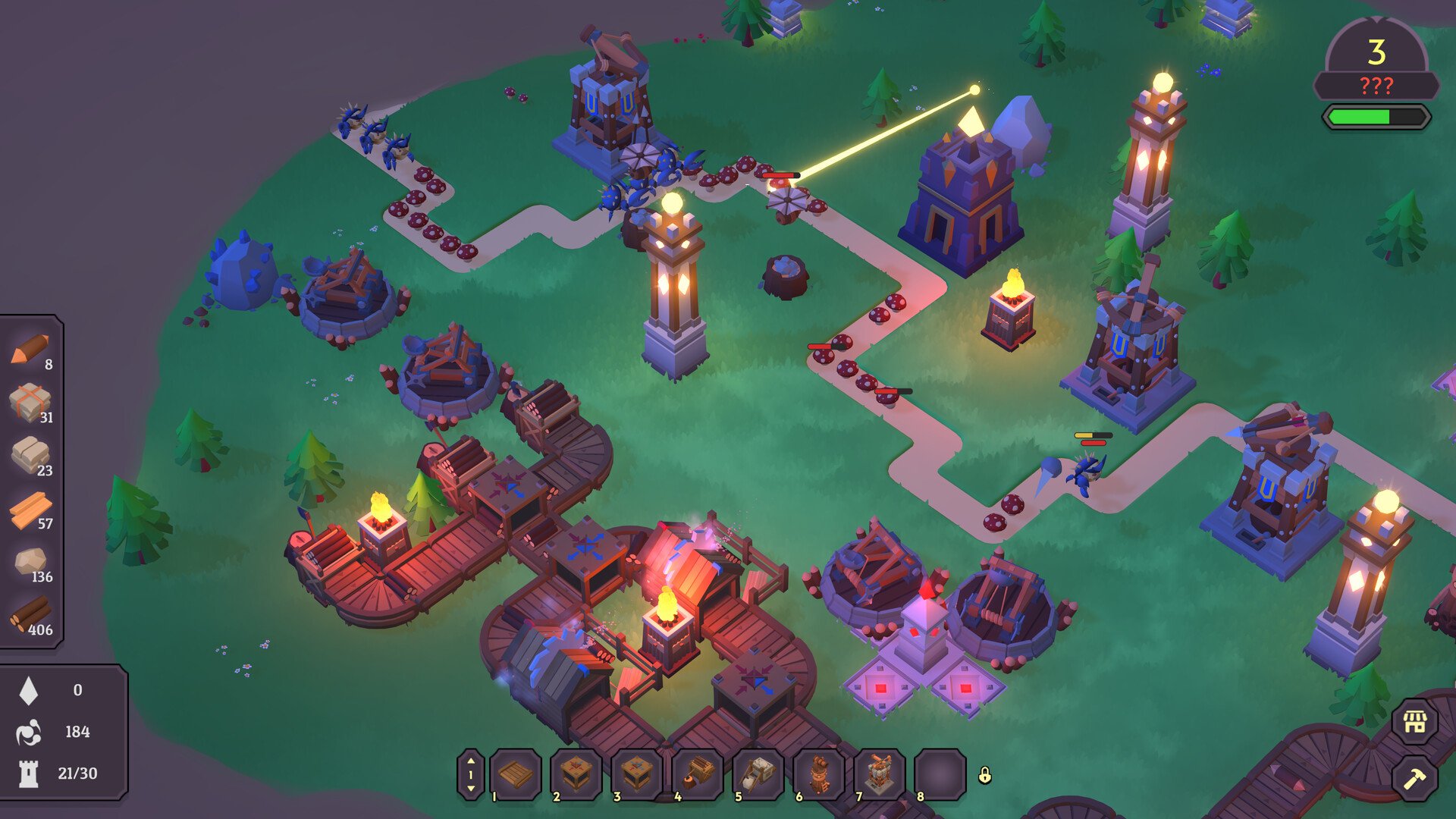 - Mine, harvest, and process materials to build 12 base towers and 24 enhanced variants