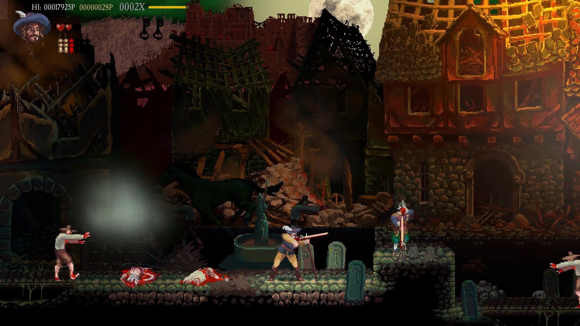Gameplay demands precision and careful resource management. Every jump and attack must be perfectly timed, and understanding enemy behavior is crucial. Many foes are not only dangerous individually but can also interfere with each other; luring them into conflict can be a strategic move. Additionally, defeating the undead is no simple task: merely injuring them is not enough. Only a well-placed, final musket shot can completely shatter their cursed form, preventing any chance of resurrection.