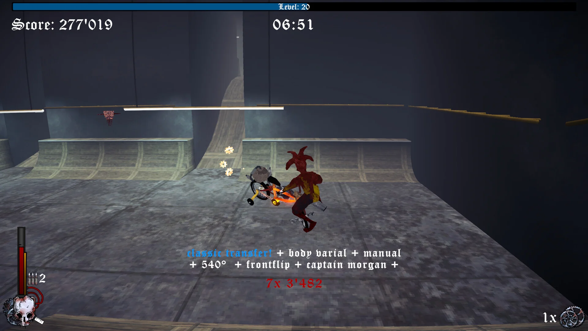 Every trick you pull off, when combined with enemy kills, boosts your score and rewards you with valuable experience points. As you rack up points, you'll be given a choice of one of three random Demonic Offerings. These card-style upgrades allow you to build and refine your deck, unlocking new cards over time to enhance your character’s abilities and adapt to the ever-growing challenges of the underworld.