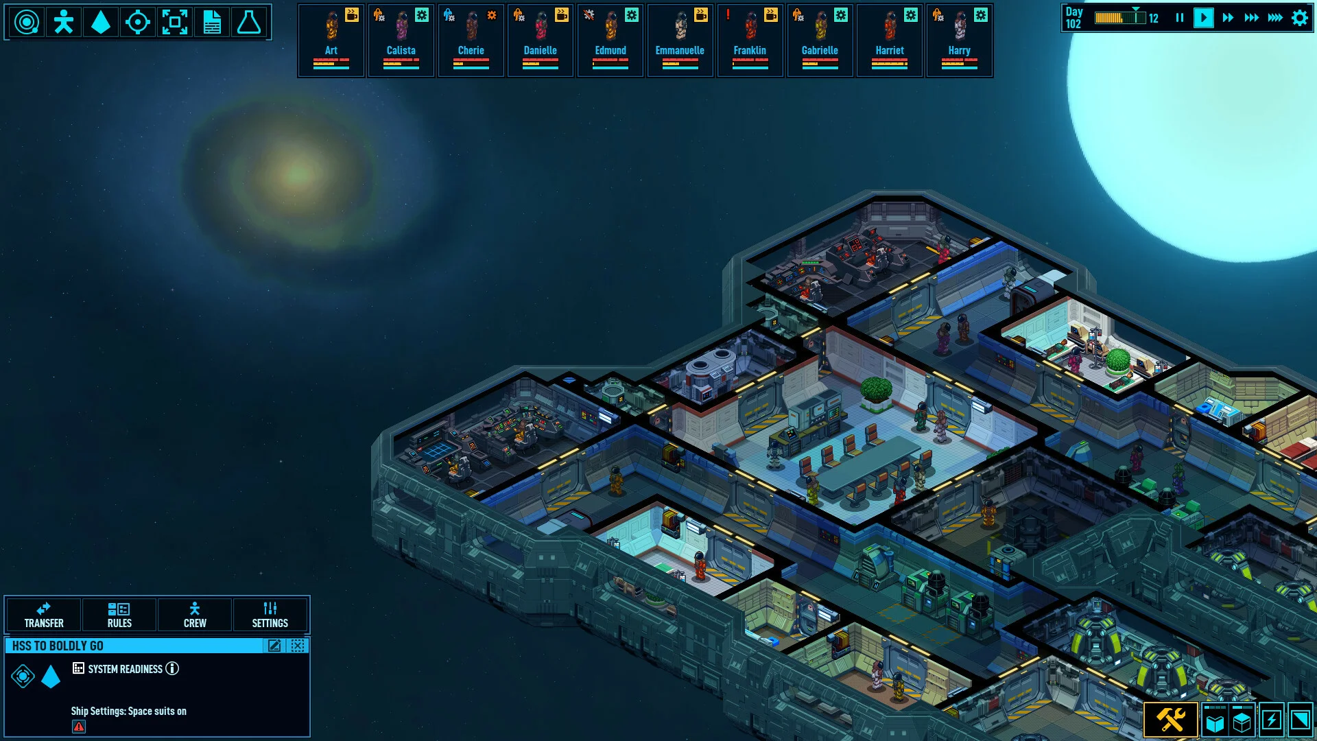 Every crew member comes with unique skills, backgrounds and flaws. Some may panic in combat, others thrive under pressure. Track their needs—food, rest, social time—and watch their moods rise or fall. Push them too hard and they might crack, refusing orders or even starting a fight.