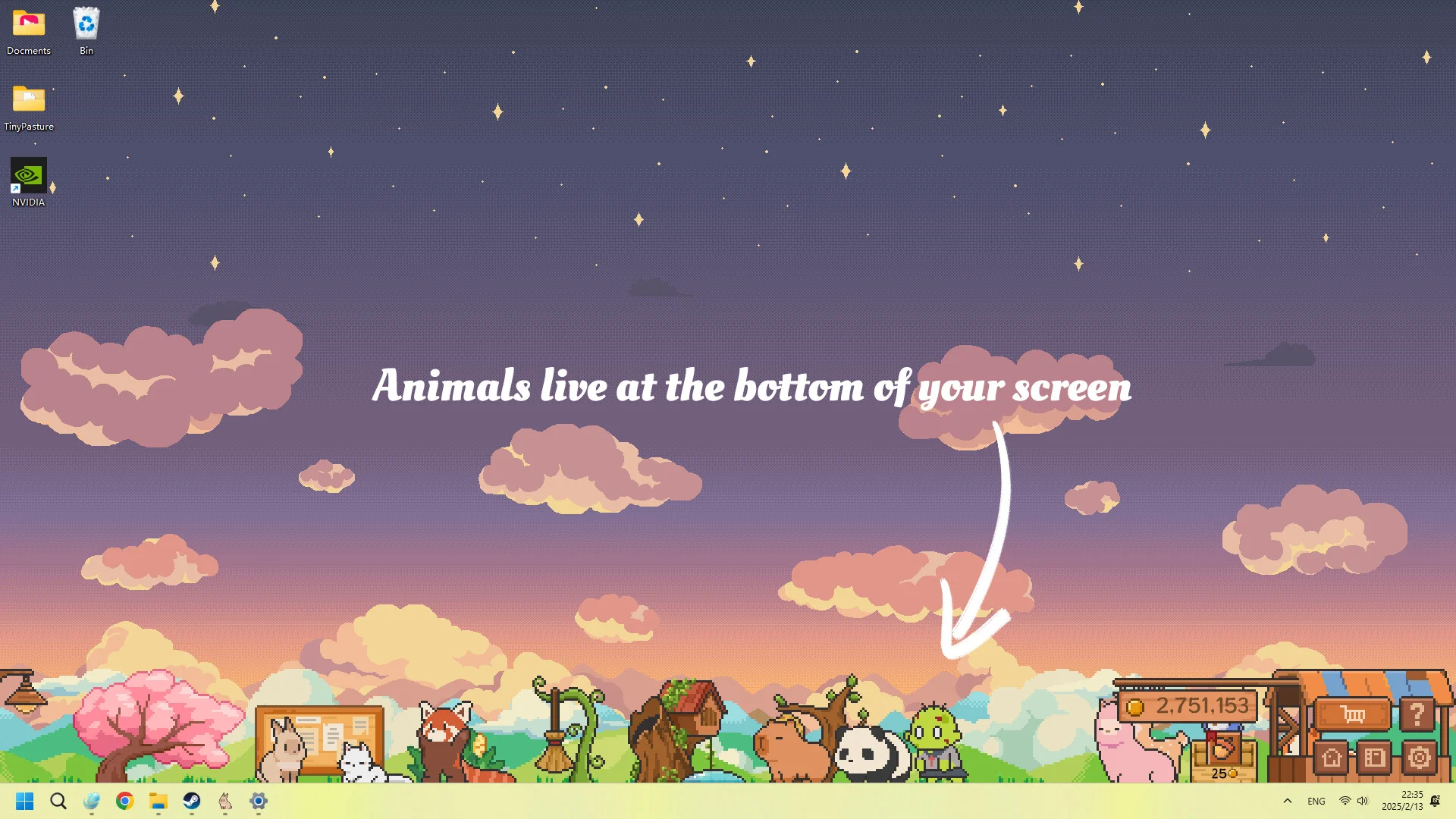 Tiny Pasture is a charming mini farm simulator that lives at the bottom of your screen while you work or study. In this always-on companion game, you purchase baby animals, nurture them to adulthood, then collect coins they drop to expand and upgrade your little pasture. As you grow your skills and earn more rewards, you’ll unlock ever more exotic—and sometimes downright bizarre—creatures to keep you company.