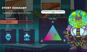 Investigative journalism is at the heart of the experience. Each cycle, you choose a story assignment-everything from shuttle crashes and intersolar cat shows to the funerals of space ghosts. Once you touch down on location, you interview more than a hundred characters, dig for clues and decide whom to trust. All your conversations feed into the Build-a-Story™ tool at the end of each shift, where your gathered facts, quotes and choices determine the tone, quality and impact of your article. Editors and readers alike react to what you publish, and over time your reporting shapes the reputation and popularity of Times & Galaxy itself.