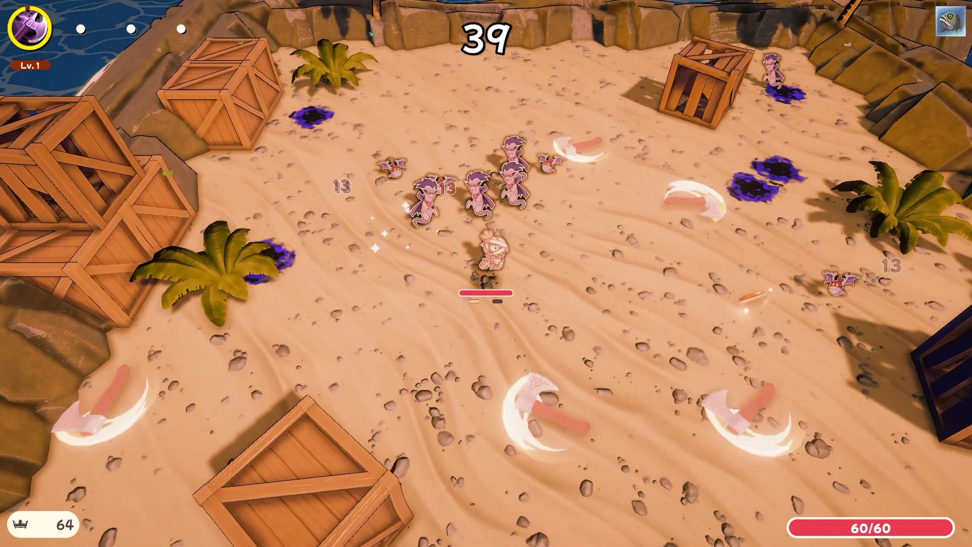 Each enemy wave lasts 30-60 seconds. Survive long enough to collect resources, then spend them at shops and campfires to power up.