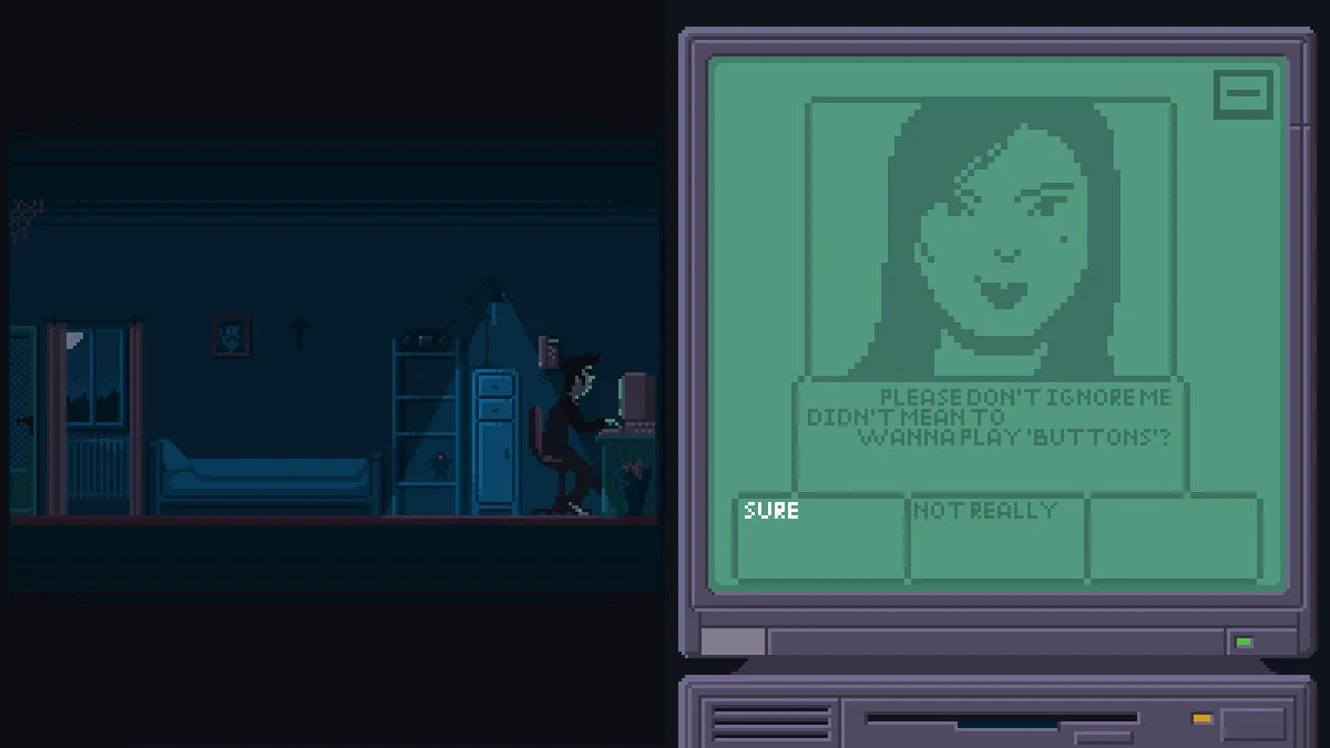 The core loop combines text-based chat choices with light point-and-click exploration. You’ll select from predetermined replies to steer the conversation, click objects in your room to trigger events, and even play mini-computer games inside the game itself. Thoughtful decision-making is rewarded-one wrong reply or overlooked clue can lead to instant permadeath.