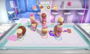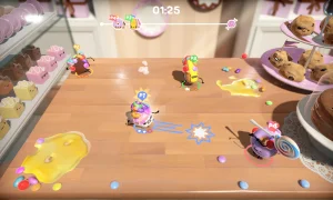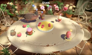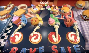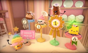 Between rounds, sample a selection of mini-games that test your baking skills: carefully roast marshmallows over a campfire, pipe frosting with precision, or outlast your opponents in the frenetic Fork Knife showdown. In Get Tasty! mode, explore a bustling bakery, shop for the freshest toppings and decorations, and outfit your cake to satisfy a picky customer’s order.