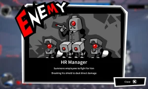 - Handle department-specific foes and environmental hazards as you push toward the CEO’s office.