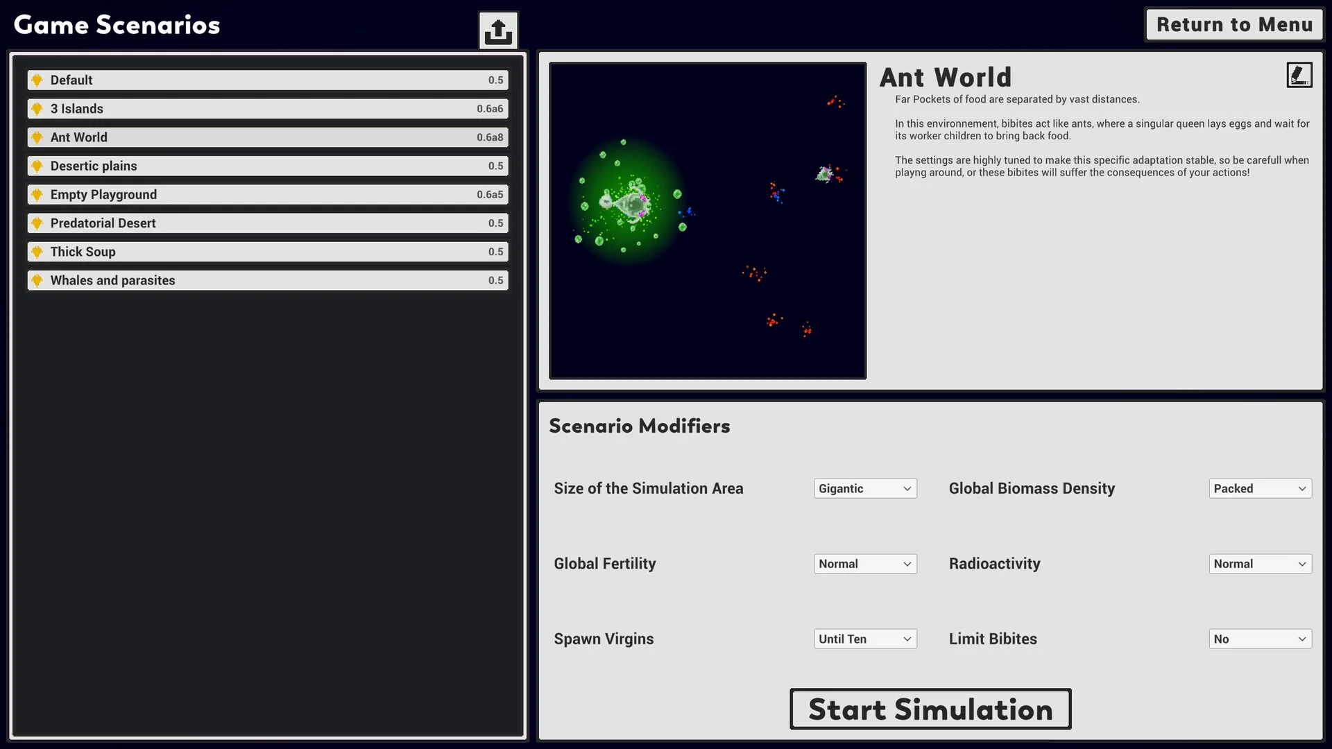 Design your own digital environments by adjusting physical and biological parameters, then populate them with Bibite templates or saved populations. Play as a benevolent creator, helping your creatures thrive, or crank up the challenge with harsh, desert-like conditions where only the strongest survive.