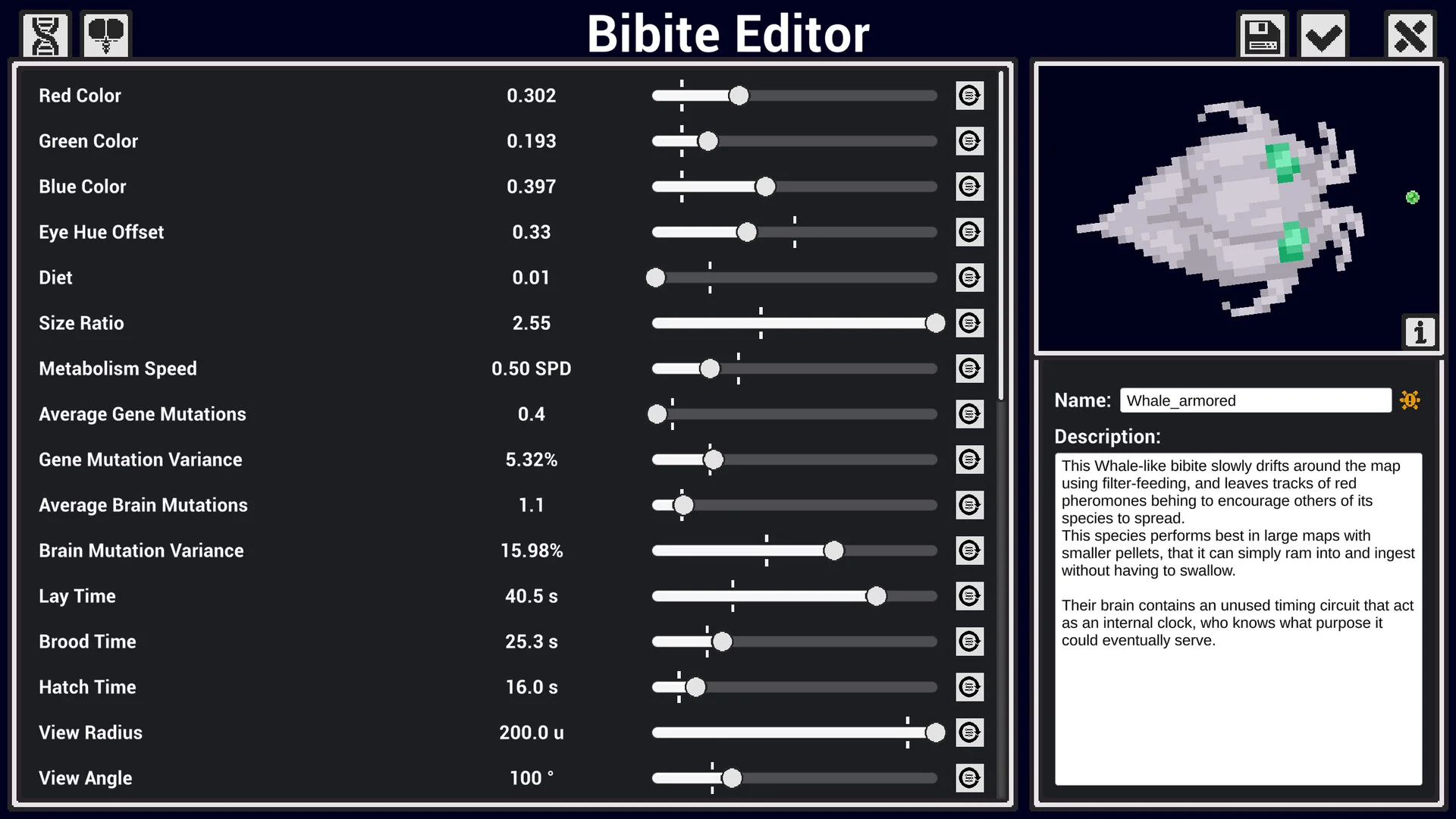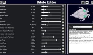 If you’d rather accelerate evolution by hand, the built-in editor lets you sculpt every facet of a Bibite’s genetic code and brain architecture. Create specialized hunters, resilient foragers or entirely new lifeforms tailored to your own vision of the ultimate creature.
