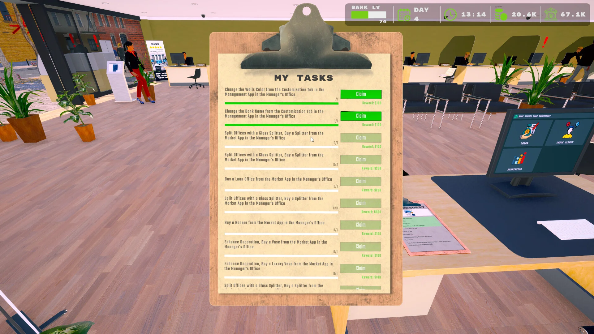 - Market: Purchase office items, equipment, and decorative pieces to expand and enhance your bank.