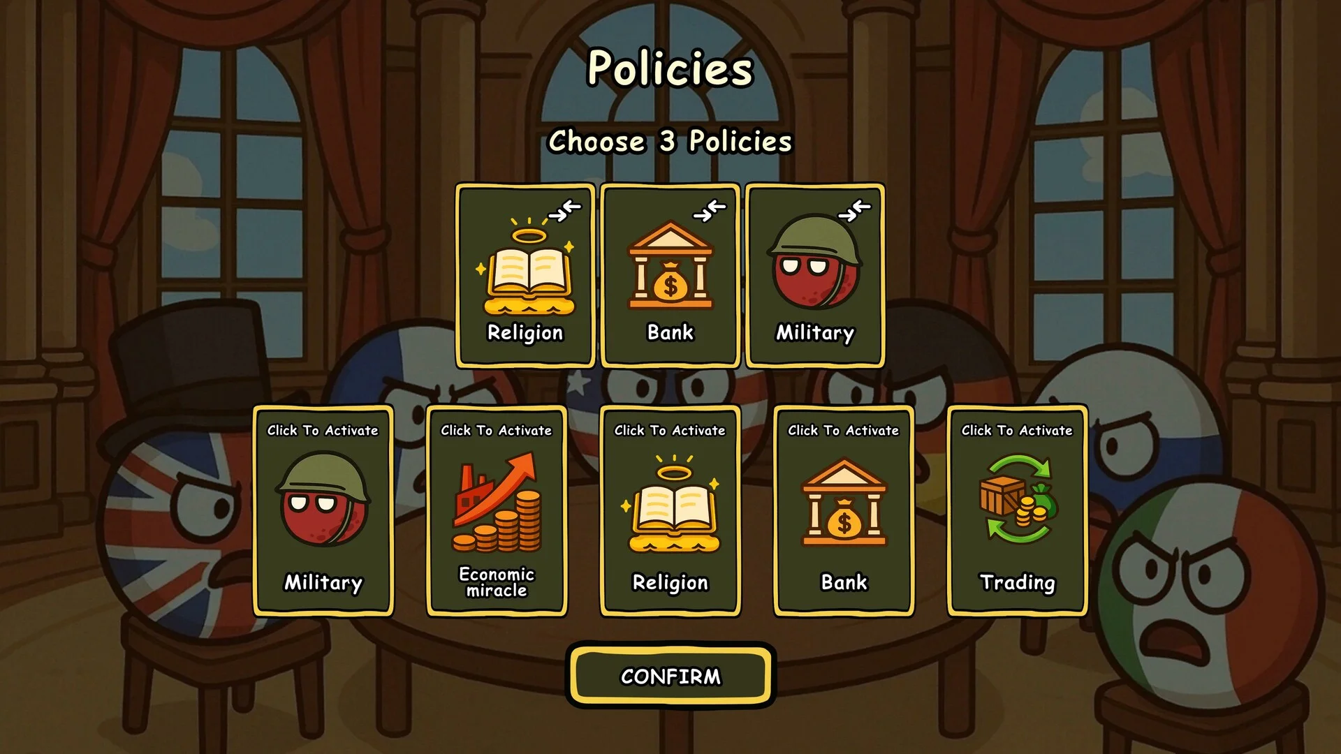 Your resources accumulate continuously, so investing in industries, trade, and upgrades fuels further expansion. You’ll balance building income over time with military and diplomatic choices: raise cartoonish armies, deploy tanks, jets, subs and missiles - even nuclear options - or win nations over by spreading ideology and converting hearts and minds. Each approach changes how the map evolves and who stands in your way.
