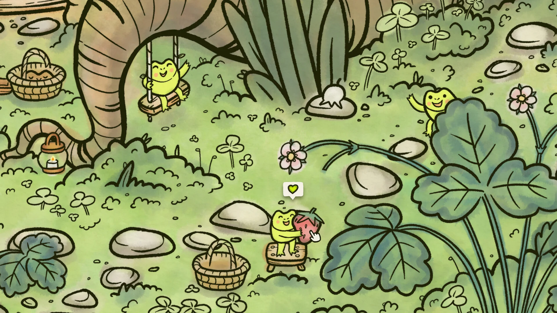 The game’s strengths are its art and atmosphere. The world is drawn with warm, whimsical detail, and you can choose day, night, or let time pass naturally, which subtly changes what you find and how each scene feels. Calming animations, soft sound effects, and soothing music reinforce that relaxed pace; small interactive touches (like helping a tiny frog pick strawberries) add personality without breaking immersion. Knowing this is a passion project by a duo of artists makes the hand-crafted vibe even more appealing.