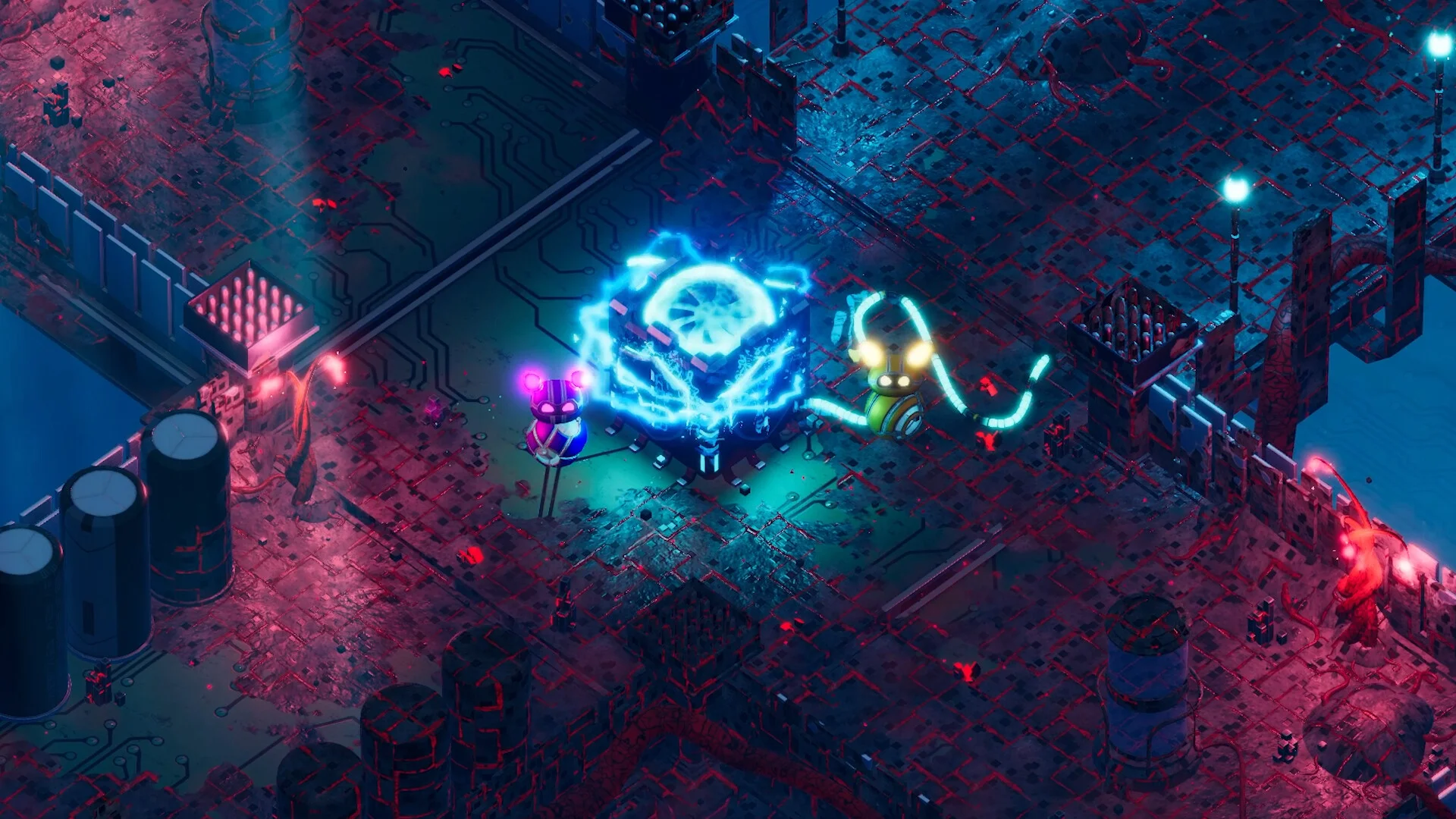 Explore a variety of neon-lit environments-from sprawling motherboard circuits and winding CPU corridors to strange, organic "data biomes"-each with its own enemies, secrets, and puzzle types. The game is built for flexible play: team up online, share a classic split-screen session, or tackle challenges solo, with full controller support and a fast-paced, accessible feel.
