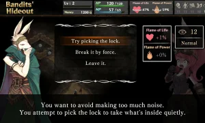 Story events are presented in an adventure-book format, and some include tabletop-style dice rolls that can change the outcome. The same encounter can play out in different ways depending on your choices and the roll results, letting you play cautiously or throw yourself into danger - with those decisions affecting Goshe’s personality over time.