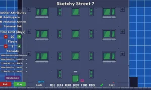 - Three playable janitors with different attributes, and 15 tenant types with individual schedules and vulnerabilities.