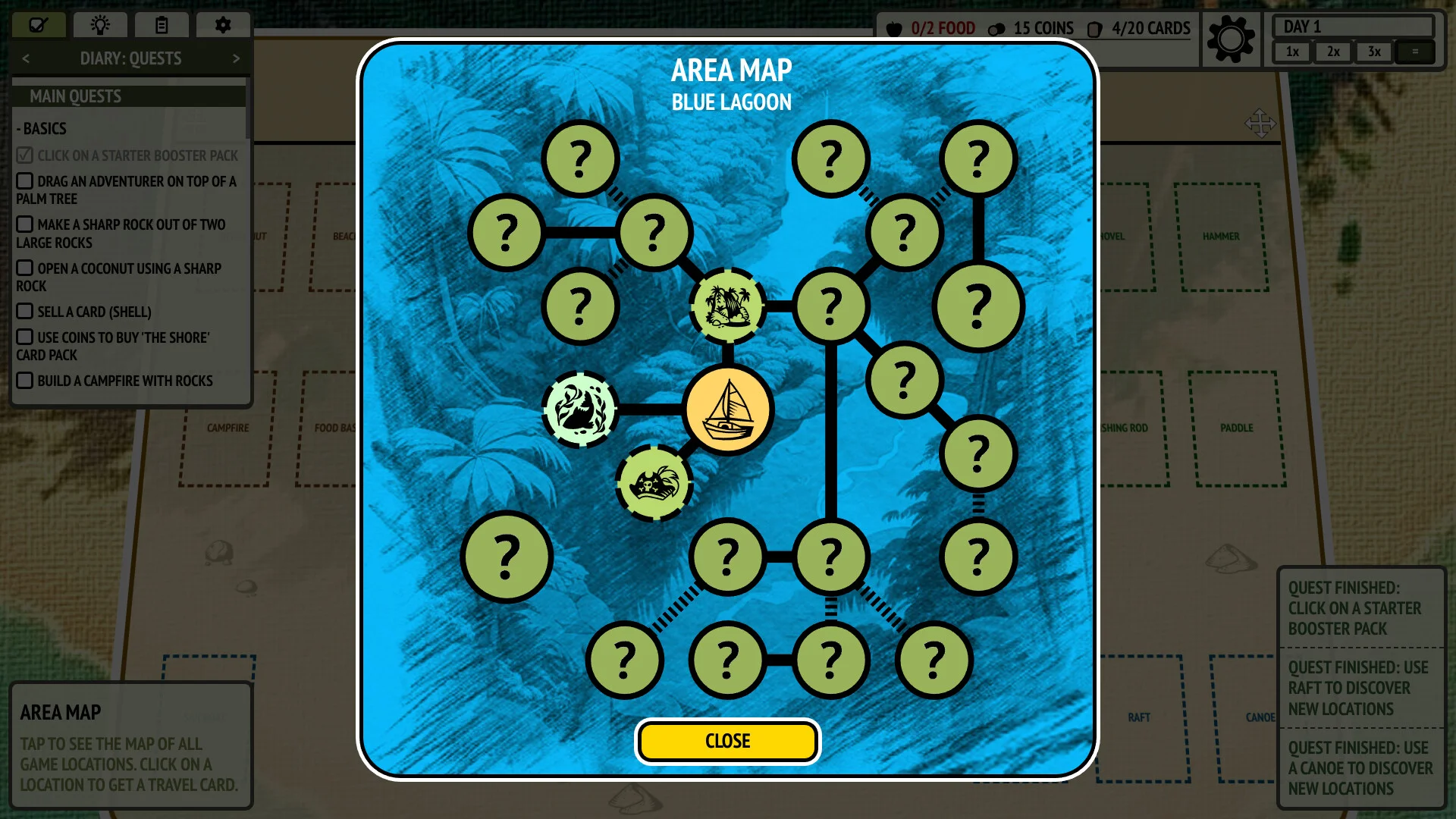 Gameplay centers on collecting and combining cards to craft tools, build structures, and gather a variety of companions and items. With over 150 unique cards and more than 70 craft recipes, the game rewards creative stacks and synergies. A simple hunger mechanic adds tension to your decisions, while 22 distinct locations and 200+ tasks and quests keep the experience varied and rewarding. You can also choose from three focused scenarios - treasure hunting, fishing, or butterfly collecting - each offering a different way to engage with the world.