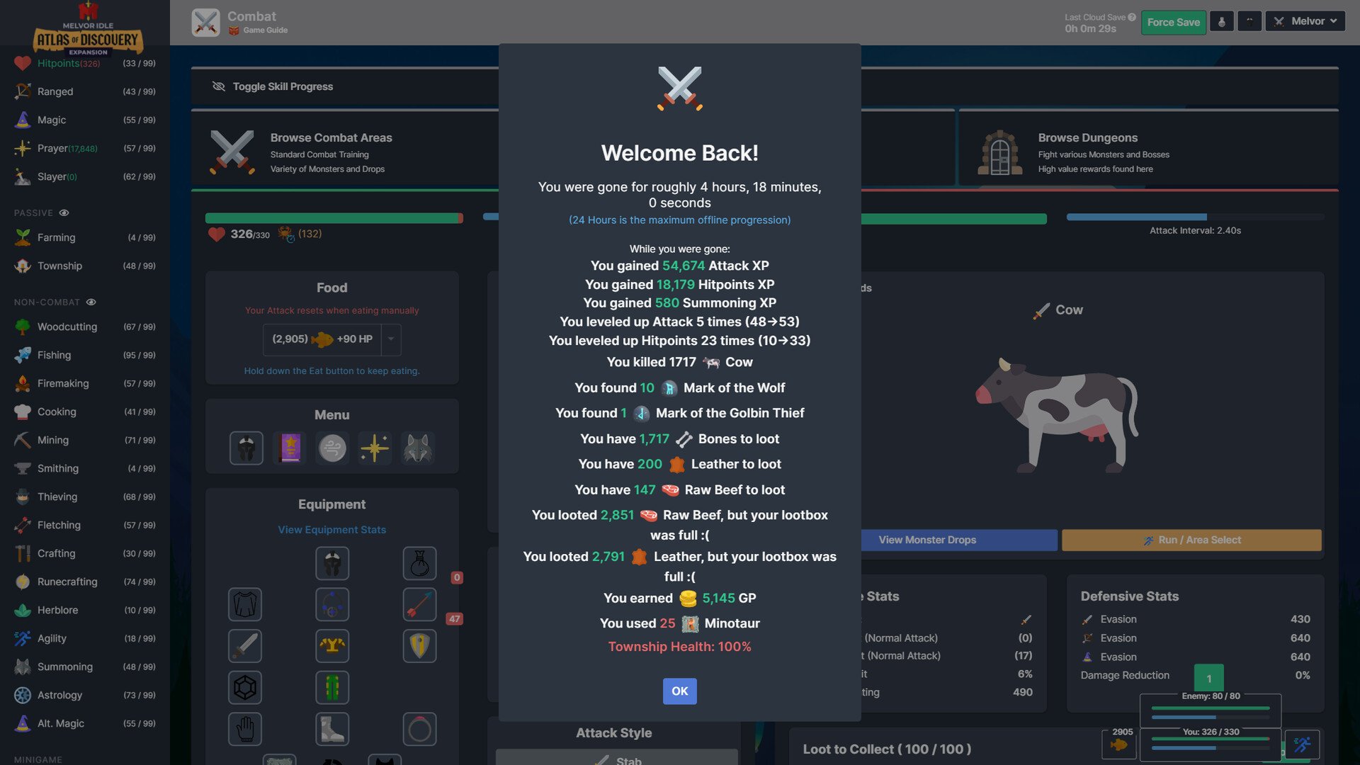 Melvor Idle includes offline progression, cloud save compatibility, and a comprehensive Bank/Inventory system. With regular updates, the game continues to expand, offering an ever-growing adventure. It features over 1,100 items to discover, 40+ pets to collect, and a robust combat system with eight dedicated skills. The game requires an internet connection but does not include microtransactions, ensuring a fair playing field for all.