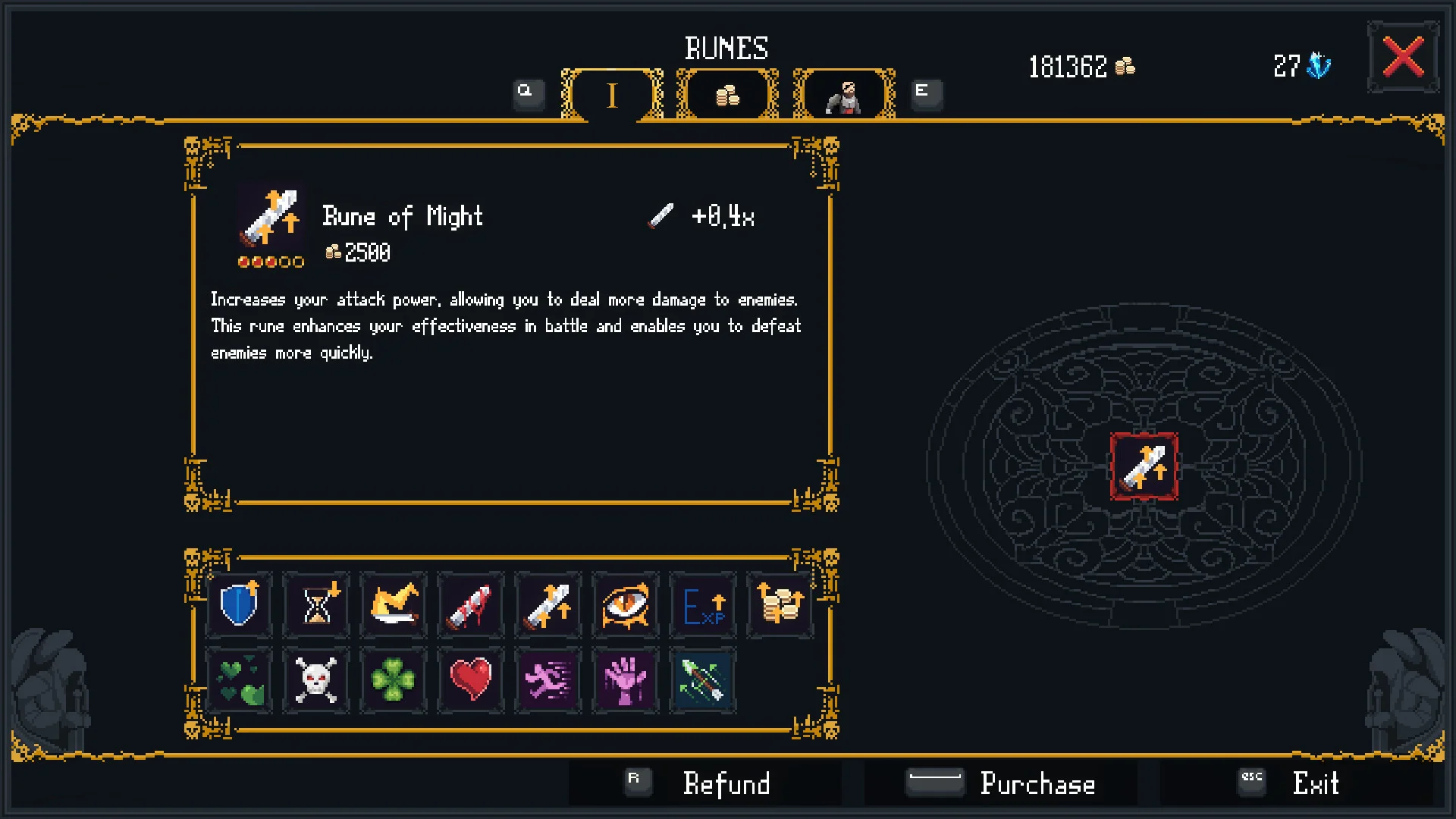 - The hub lets you spend gold and shards to unlock characters, buy runes, purchase armors, rings and even empowered versions of skills that permanently evolve your options between runs.