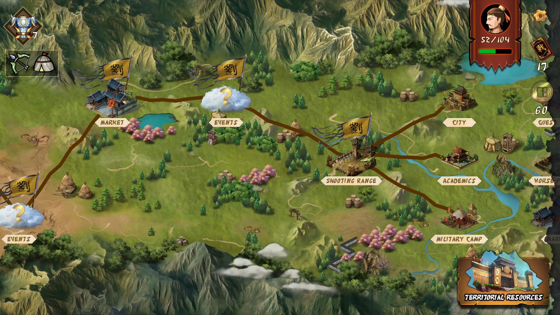 - Map-based progression: nine territory types, city points, and branching choices.