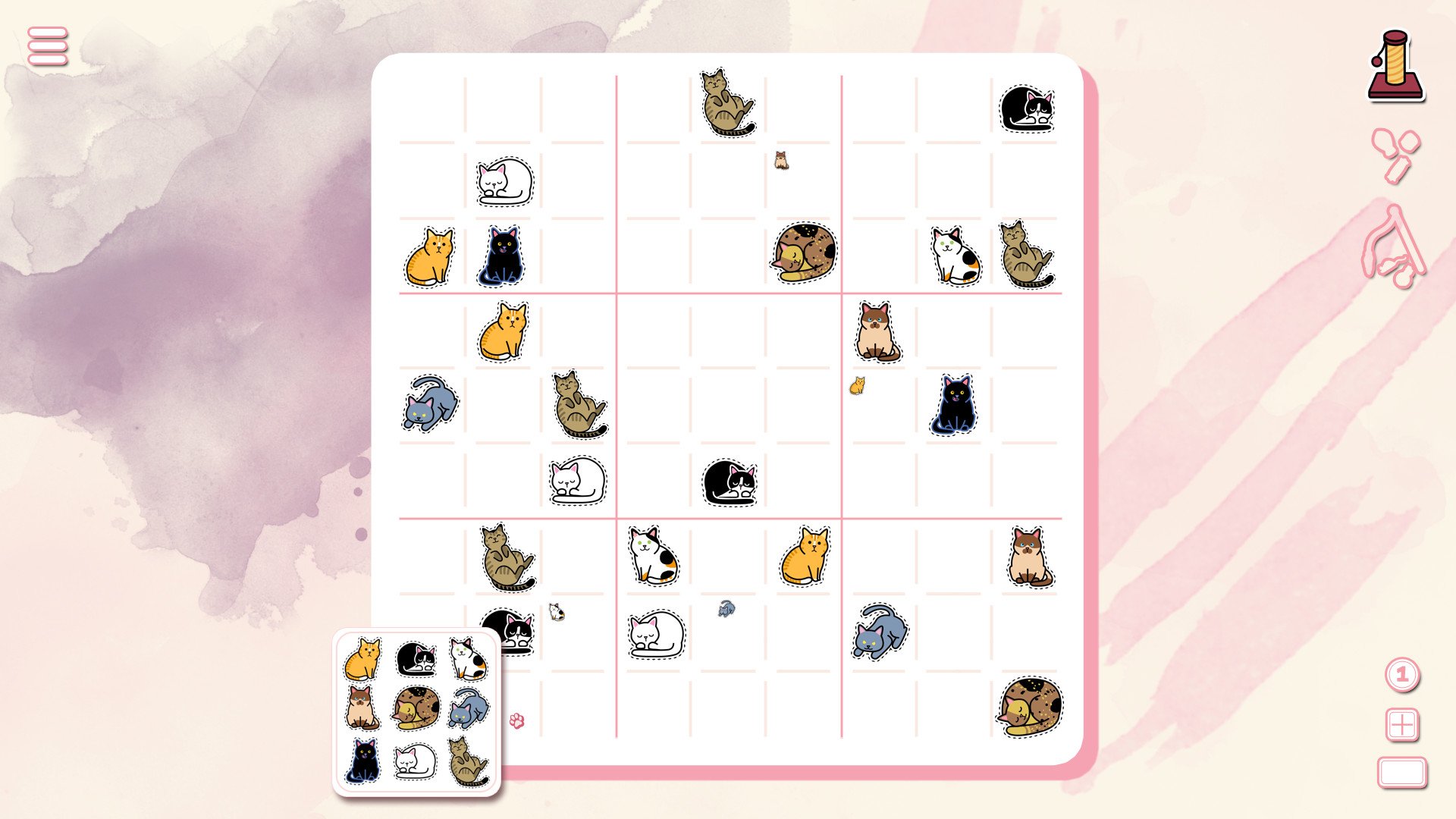 Sudocats is a charming puzzle game that combines the classic challenge of Sudoku with the delightful theme of cats. The game requires you to strategically arrange cats in a grid, ensuring they are introduced to each other in a harmonious order. This mirrors the real-life process of gradually introducing a new cat to a household with existing feline residents. Sudocats offers a relaxing experience with puzzles available in 4x4, 6x6, and 9x9 grid sizes. Players can customize the grid and background to their liking and have the flexibility to switch between using cats or numbers at any time.