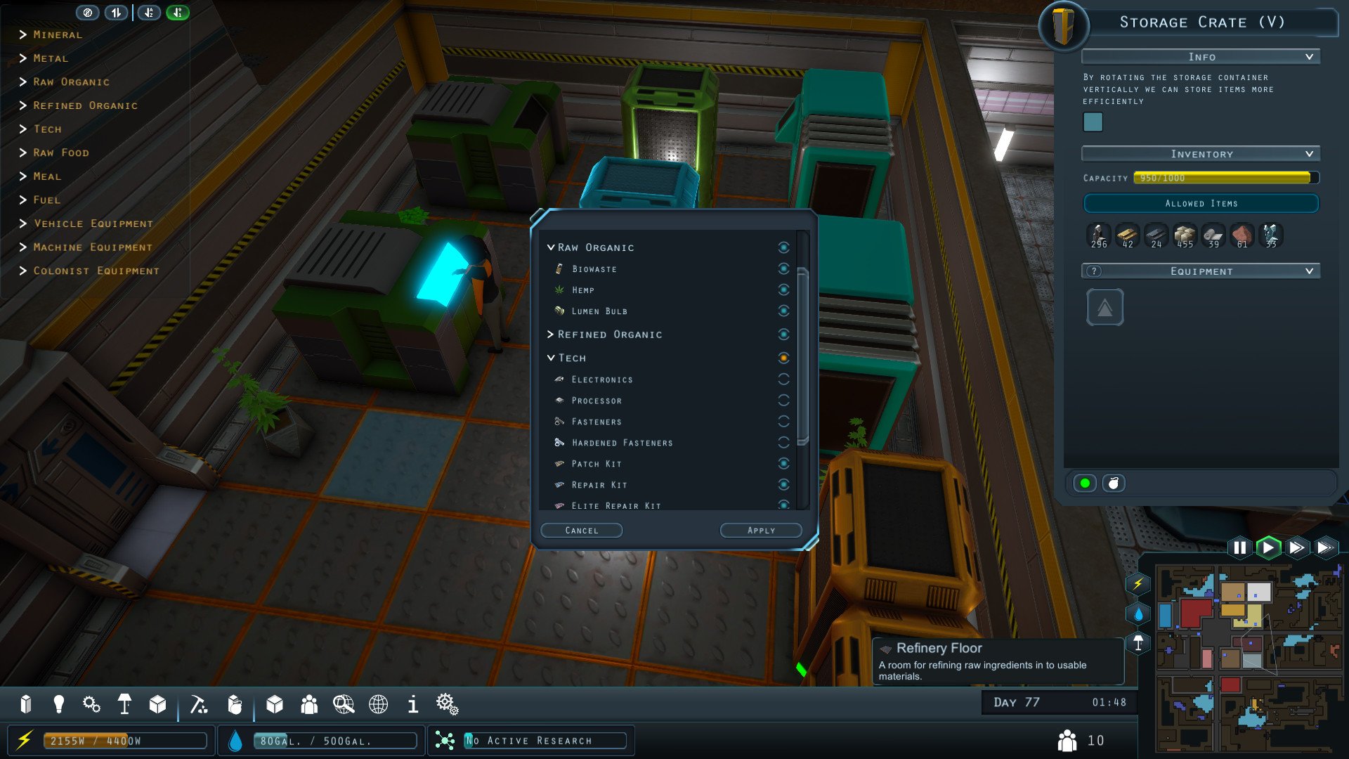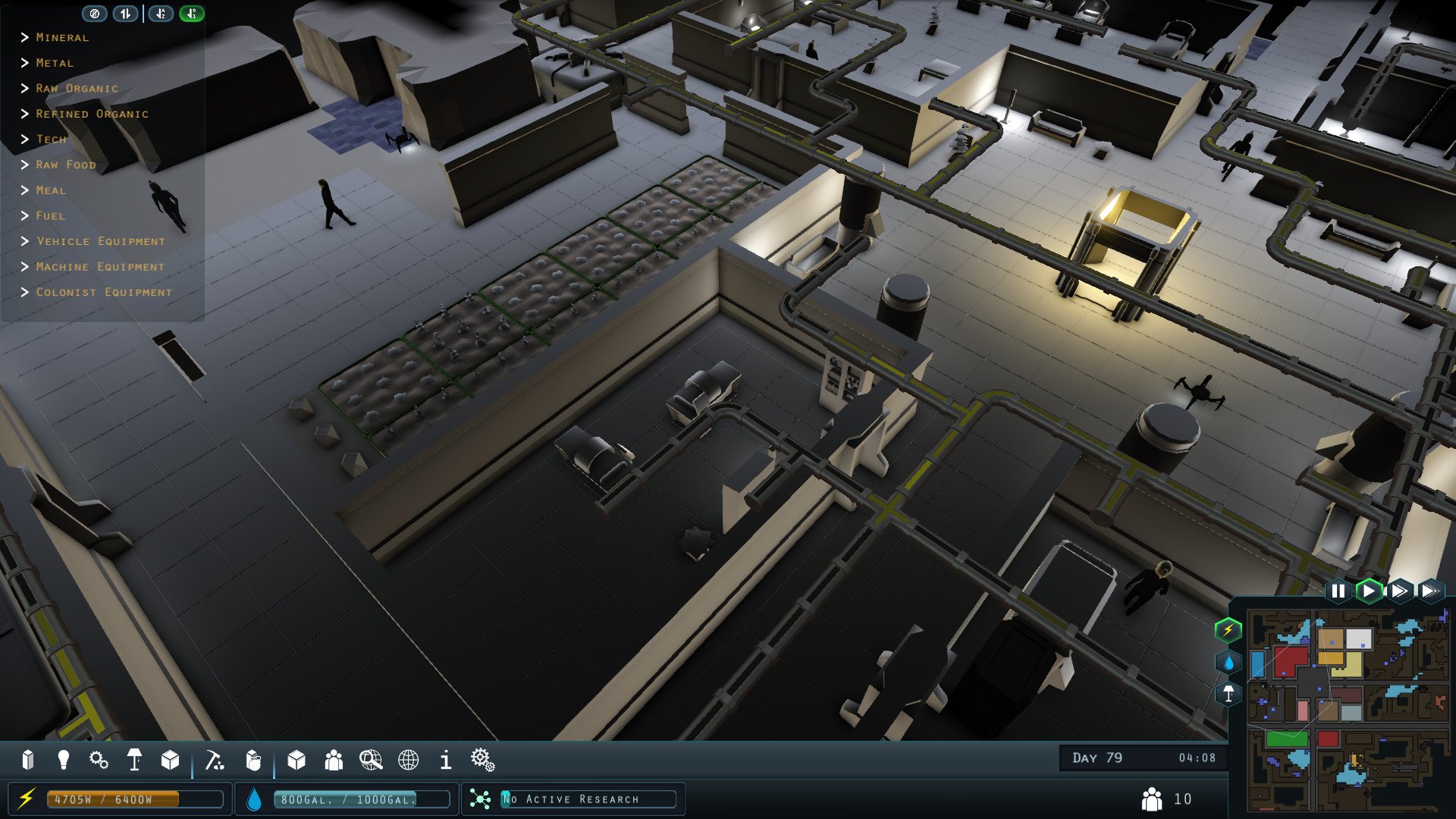 The game also involves managing colonists' needs by designing and constructing various areas such as sleeping quarters, recreation spaces, and crafting zones. Each colonist has unique quirks that affect their behavior, and players must manage their schedules to keep them happy and motivated.